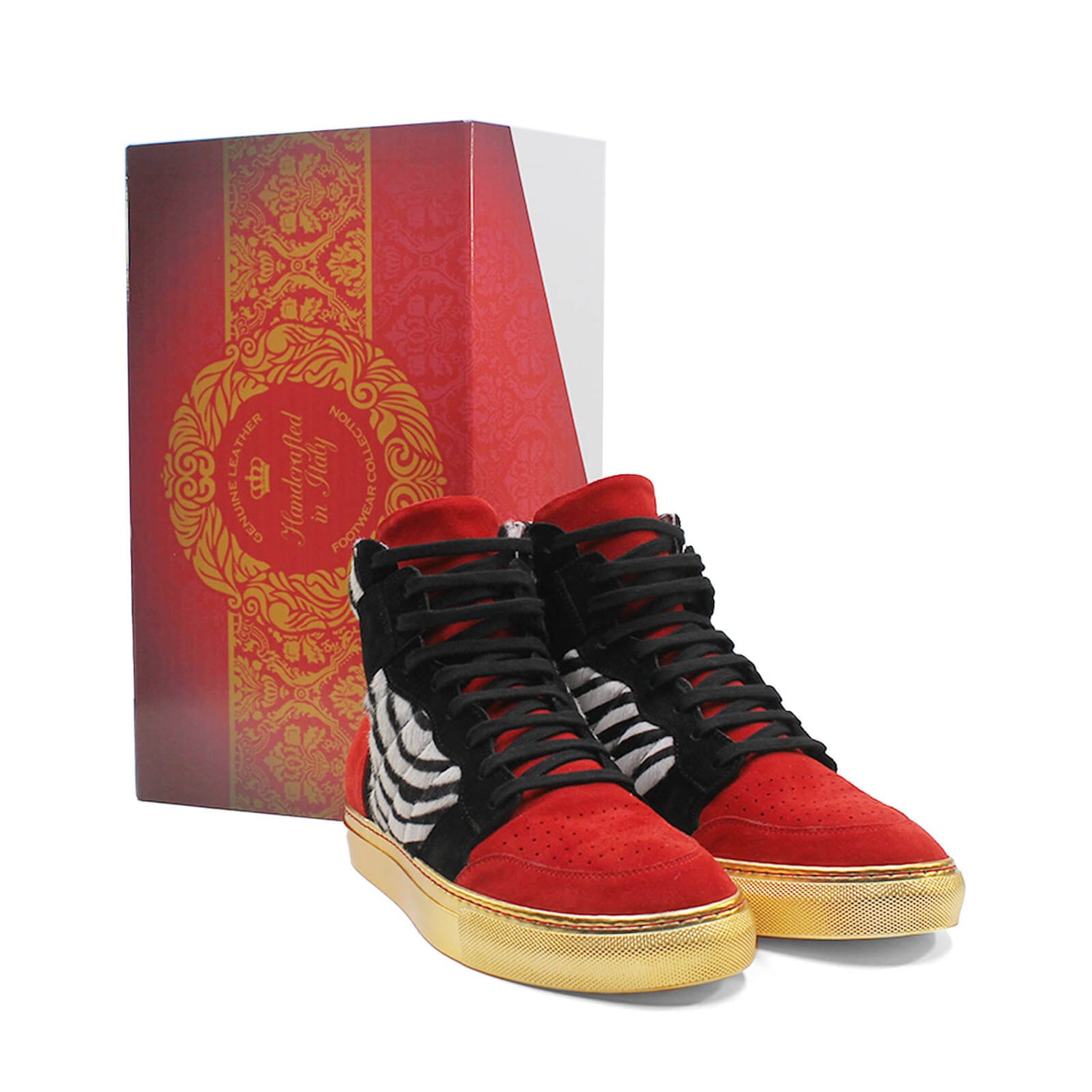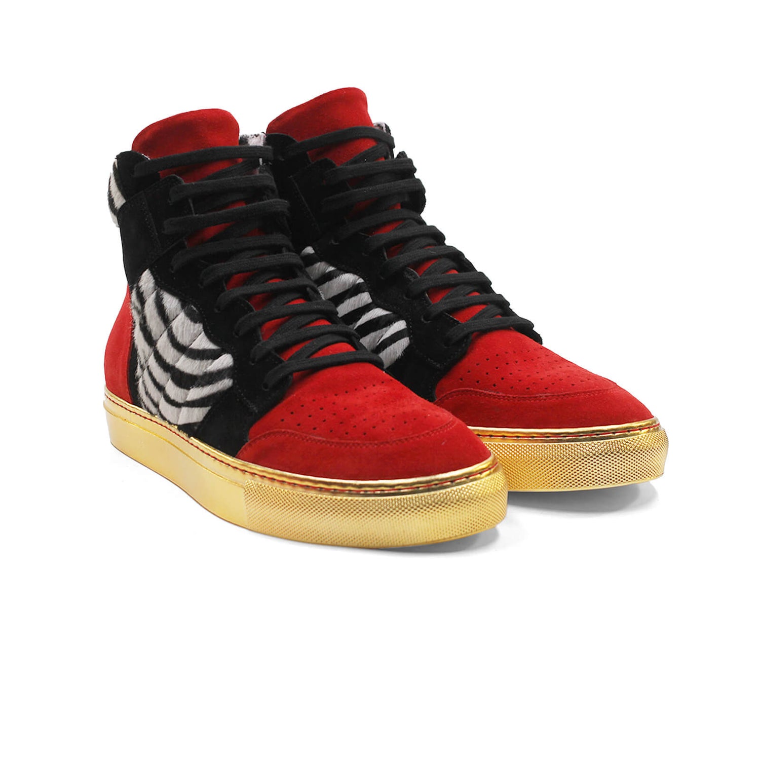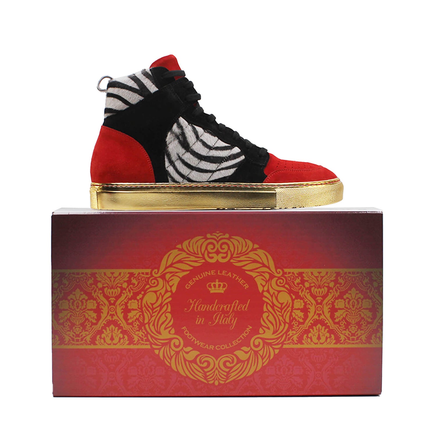 The R Julain Baxster aka The Baker. As one my favorite desins to date this retro basketball design is one that you may see often with the Reece Julian brand. Eventhough it was not the first design of this basketball retro it will definitly stand out among them. I went with the Michael Jordan championship Chicago Bulls colors being that Jordan is my favorite basketball player. Check out the solid gold sole that was added for a little bling. Covered in all Italian Suede with the addition of the zebra print fur makes this a one of a kind retro thats sure to turn heads when you walk in the building.