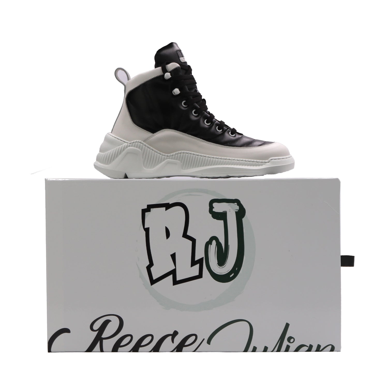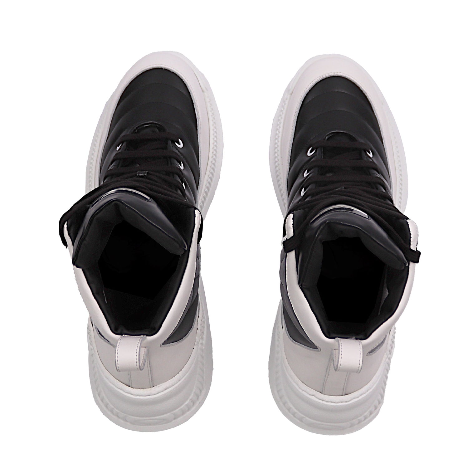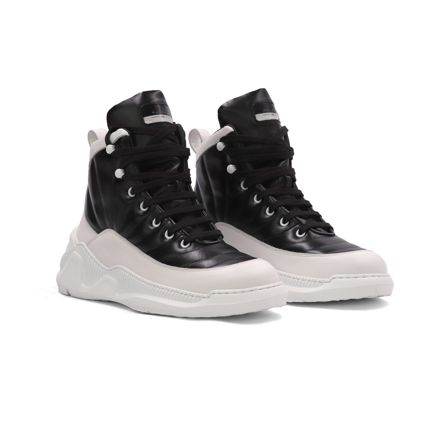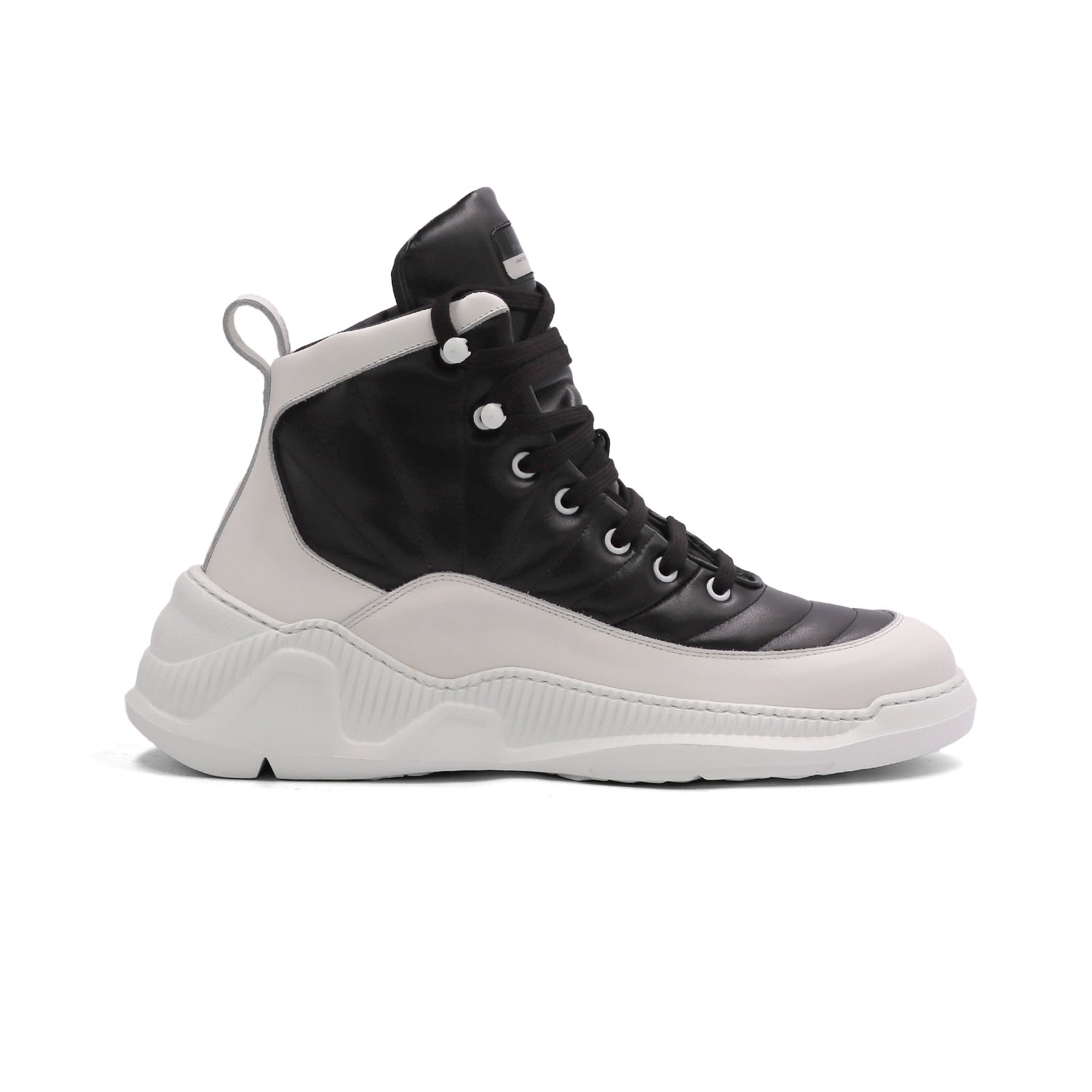 .This high-top sneaker offers a futuristic twist on a classic hiking boot design, featuring silver metallic hooks, reinforced eyelets, and an oversized padded tongue with a branded logo. The lightweight rubber sole and richly embossed Italian materials add durability and style.